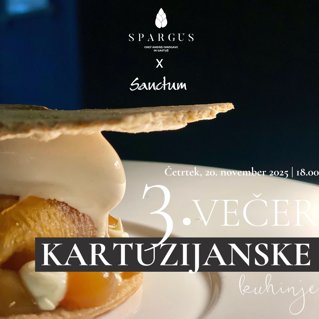 Tretji večer kartuzijanske kuhinje prinaša preplet starih samostanskih receptov in sodobne kulinarike. Chef Andrej Smogavc z vinarsko hišo Sanctum ustvarja edinstven večer okusov, ki povezuje tradicijo Žičke kartuzije in navdih današnjega časa.